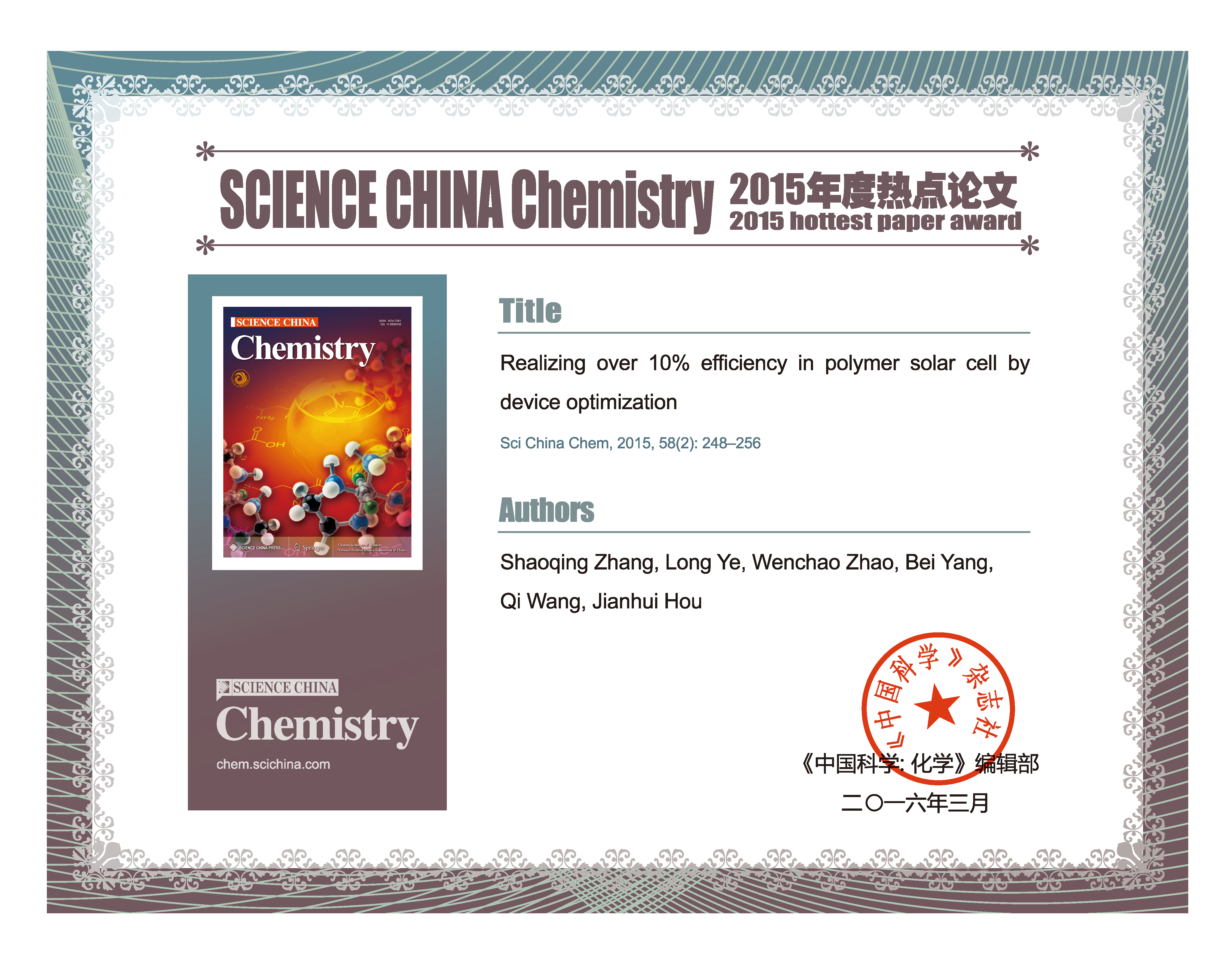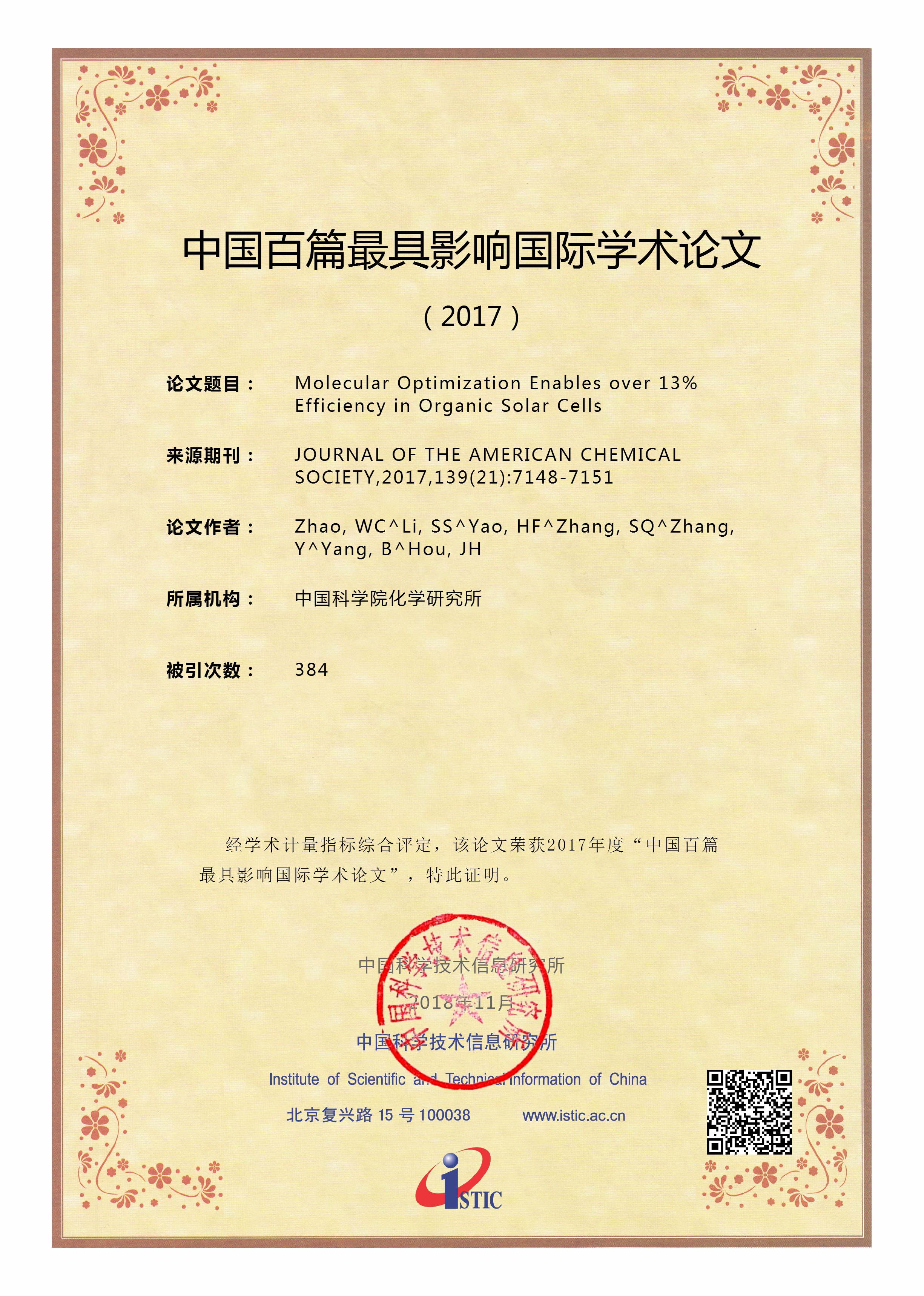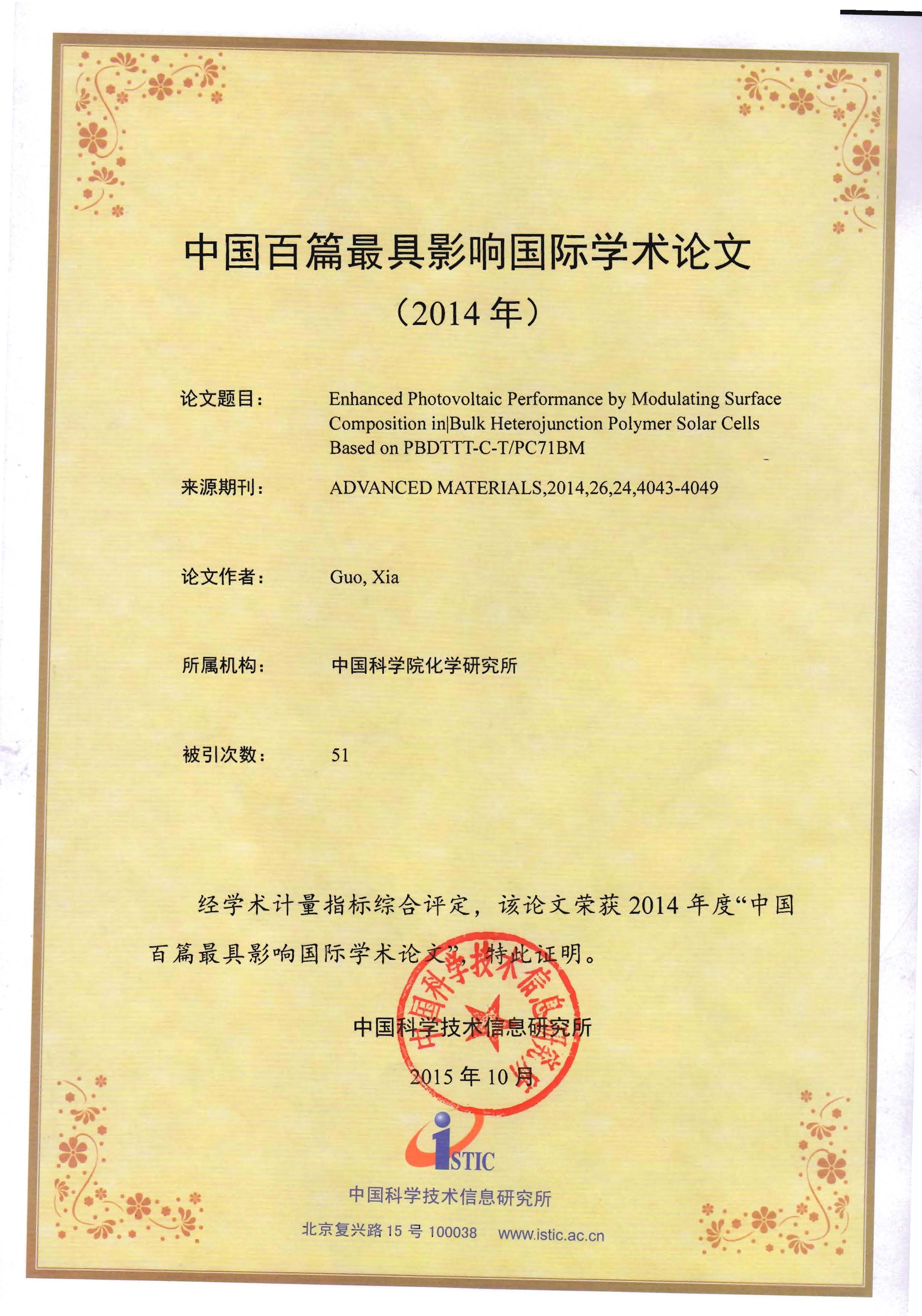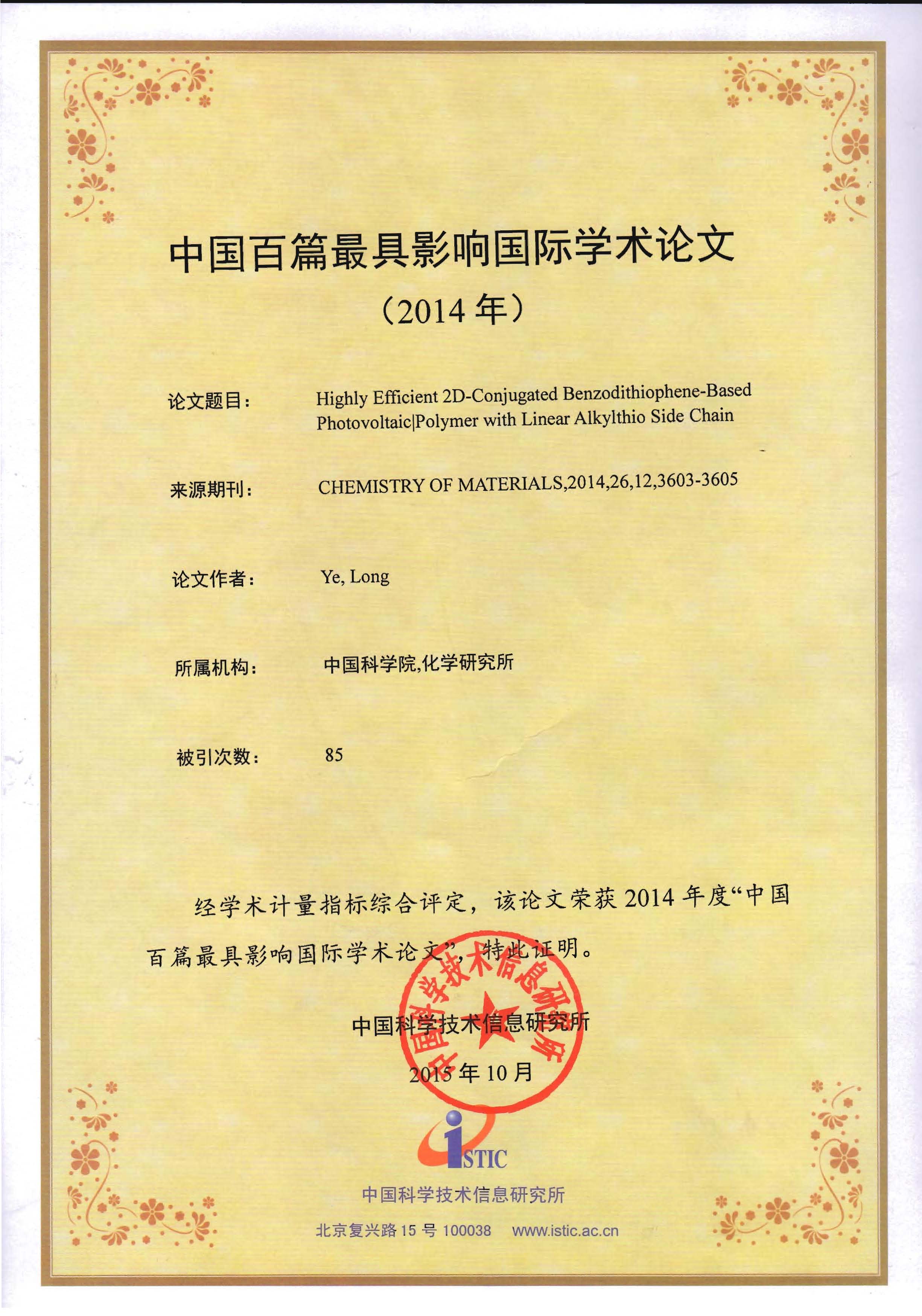 论文入选2014年度"中国百篇最具影响国际学术论文"